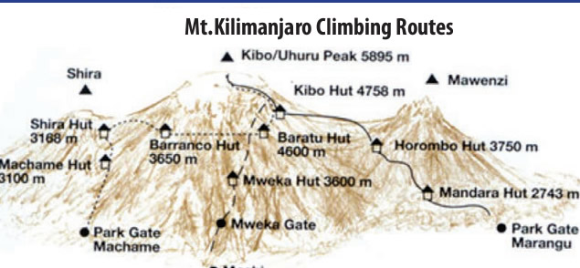 The Marangu or main route is by far the most popular way to the summit. The ascent is more gradual and no professional equipment is required. The accommodation on the way up and down is provided in mountain huts with all the basic necessities. There are 60 bunk beds each (for 60 people each) at Mandara Hut (2700m) and Kibo Hut (4700m), and 120 bunk beds (for 120 people) at Horombo Hut (3720m) which is also used for descent. Climbers are supplied with mattresses and pillows, but sleeping bags should be brought along. There are communal dining halls, washrooms and toilets.