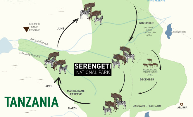 A million wildebeest… each one driven by the same ancient rhythm, fulfilling its instinctive role in the inescapable cycle of life: a frenzied three-week bout of territorial conquests and mating; survival of the fittest as 40km (25 mile) long columns plunge through crocodile-infested waters on the annual exodus north; replenishing the species in a brief population explosion that produces more than 8,000 calves daily before the 1,000 km (600 mile) pilgrimage begins again.